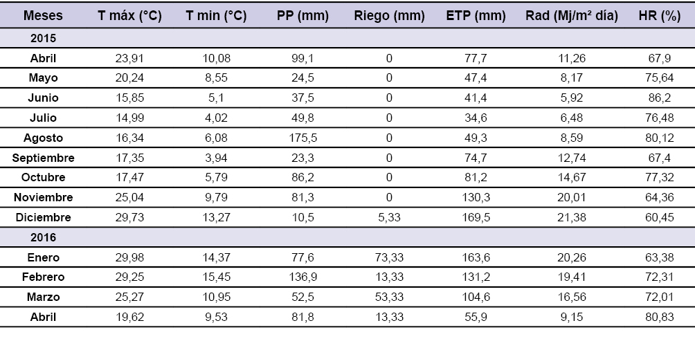 Los datos climáticos fueron proporcionados por la Estación Meteorológica de la EEA INTA Balcarce, ubicada aproximadamente a 300 m de las parcelas experimentales (tabla 1).
