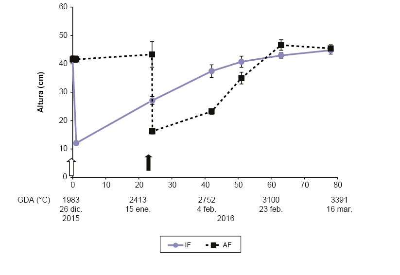 Referencias: GDA, grados días acumulados; las flechas con y sin relleno indican los momentos de los cortes, al inicio y avanzada la floración, IF y AF, respectivamente.