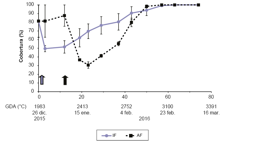Al momento del corte, la cobertura del canopeo fue del 81,33 ± 18,66% y del 87,66 ± 12,33% para IF y AF, respectivamente (figura 3). Luego de los cortes, la cobertura se redujo aproximadamente en un 50% y 70% para IF y AF, respectivamente (figura 3). Todas las parcelas alcanzaron el 100% de cobertura en la misma fecha y suma térmica (figura 3).