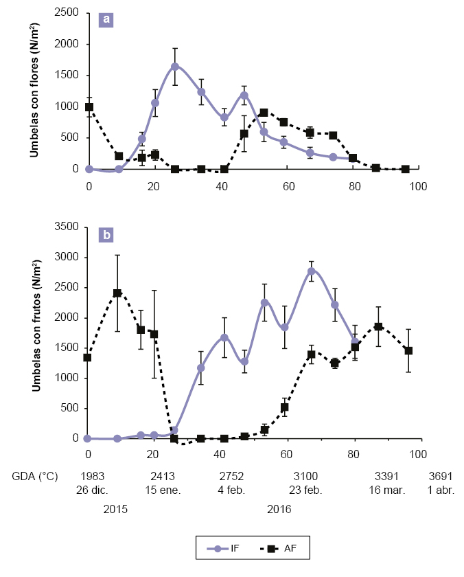 Flores. Los cortes afectaron la dinámica de la producción de umbelas con flores (figura 4a) y con frutos (figura 4b). Luego de los cortes, las plantas de L. tenuis reanudaron el crecimiento y fueron evidentes dos picos de producción de umbelas con flores. En IF el primer pico fue a los 2.523°Cd y el segundo, de menor importancia, a los 2.878°Cd (figura 4a). En AF el primero y segundo pico fueron a los 1.983°Cd y a los 2.990°Cd, respectivamente (figura 4a).
