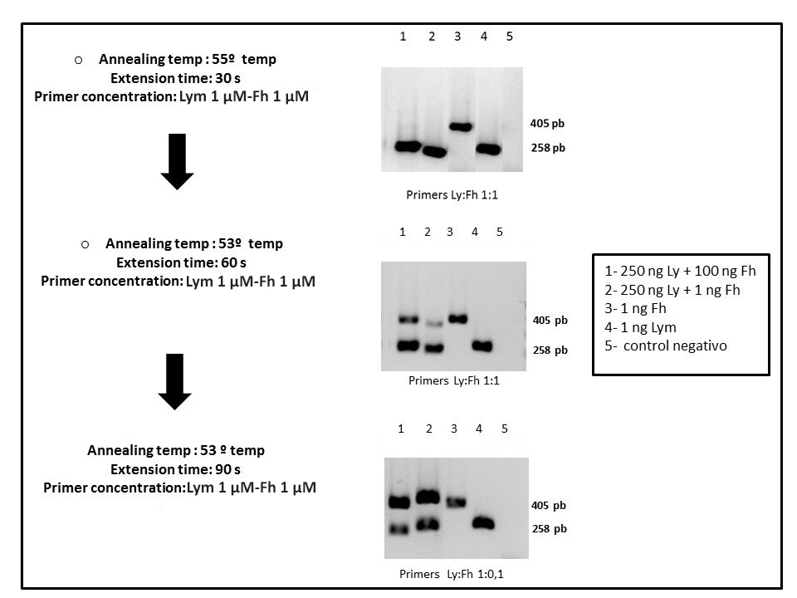 Interestingly, the snail band was detected in all the reaction mixtures and cycling parameters evaluated to set up the duplex PCR, while the F. hepatica band was only amplified after increasing the extension time and reducing the concentration of primers specific for the snail band. This is in agreement with previous reports that suggest performing these modifications in multiplex PCRs when long products are weak or absent (Henegariu and Heerema, 1997).