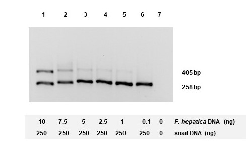 The detection limit was 1 ng of F. hepatica in the presence of Lymnaea spp. DNA, which is optimal since it allows the identification of one miracidium (2.5 ng/µl) in one snail, which is the biological unit intended to detect (Kaplan and Reed, 1997).