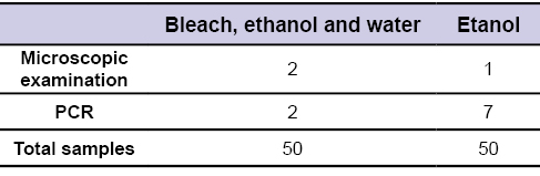 To compare the duplex PCR and microscopic examination, these techniques were conducted in parallel in field-collected snails. Also, we compared both techniques in two sets of snails (n=50), following two disinfection protocols for the material used to manipulate snails. In one case, we cleaned all the material with bleach, water, and ethanol 70%, as previously reported to avoid carry-over contamination in molecular techniques (protocol Nº1) (Bonne et al., 2008). In the other, we cleaned the material only with ethanol 70% (protocol Nº2).