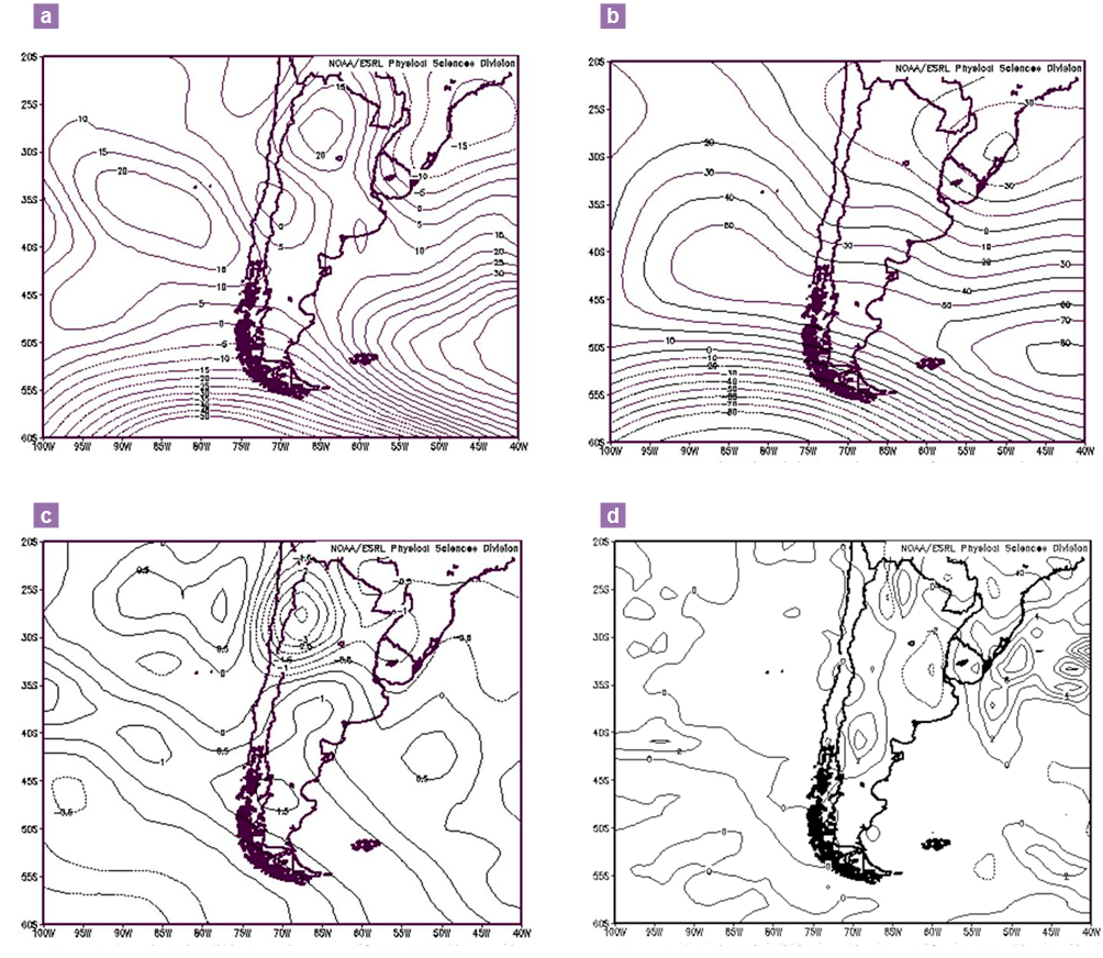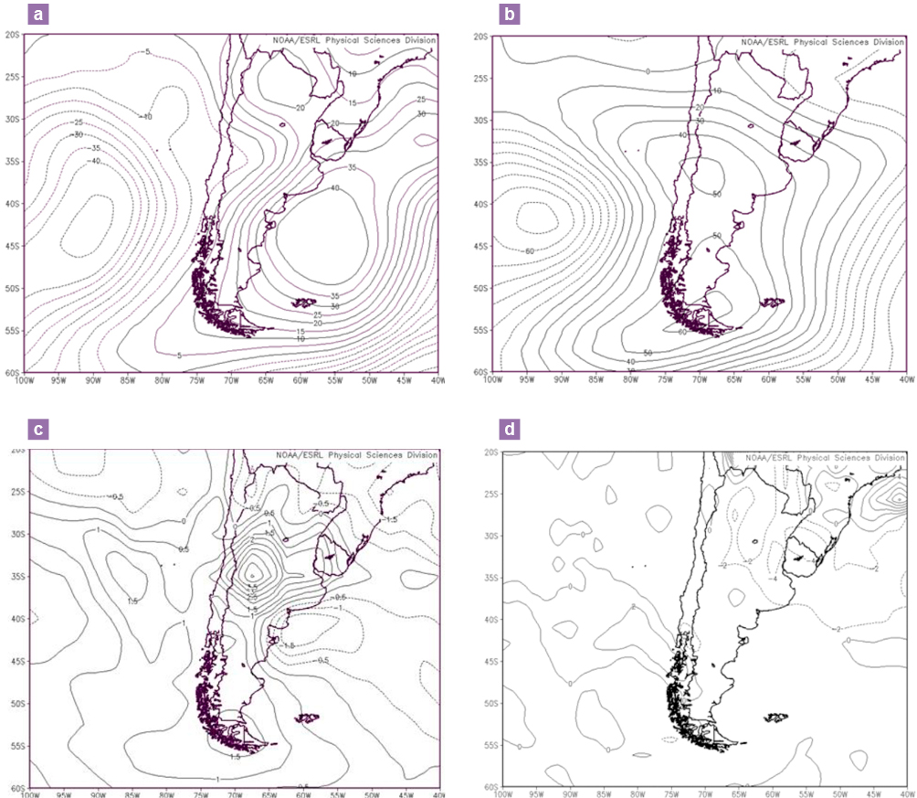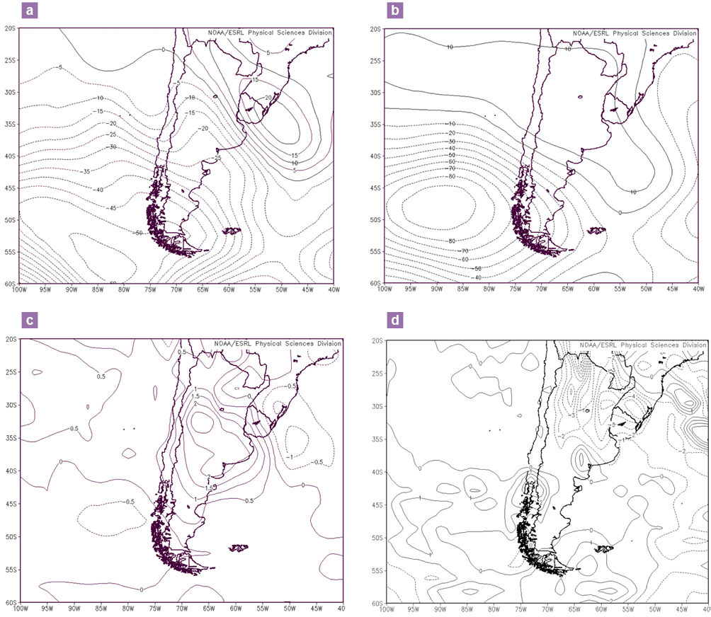 En el campo de anomalías de 500 hPa se observan también dos centros de anomalías opuestos uno localizado sobre el océano Pacífico y el otro sobre Argentina, extendiéndose hacia el océano Atlántico, cuyos signos inducen a un flujo anómalo desde el norte. El centro de anomalías positivas sobre la Patagonia implica una disminución del flujo oeste sobre esta región (figuras1b).