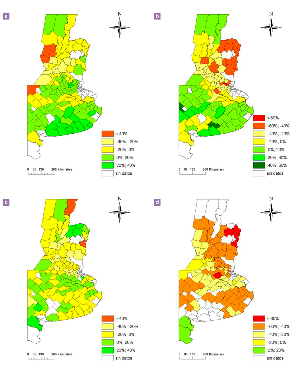 Disminuciones y aumentos porcentuales de los R departamentales de maíz, respecto a los Raj, en las provincias de Santa Fe, Entre Ríos y Buenos Aires. Campañas: a) 1996/97; b) 1999/00; c) 2005/06 y d) 2008/09.