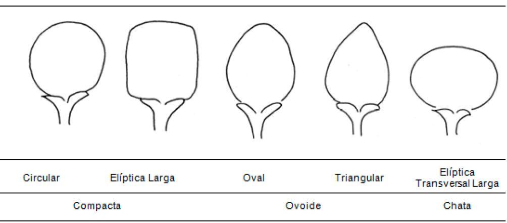 A fin de que los descriptores de forma de los capítulos resultara más accesible a los consumidores que participaron de la prueba, se utilizaron términos de uso más familiar para ellos; las formas circular y elíptica larga se reunieron bajo el término “compacta”, oval y triangular como “ovoide” y se identificó como “chata” a la forma elíptica transversal larga (figura 2).