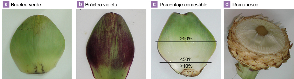 El color de las brácteas se estableció diferenciando entre verdes (figura 3a) y violáceas (figura 3b) y el porcentaje de la parte comestible en estas se evaluó de acuerdo a lo indicado en la figura 3c. La presencia de “pelos o pinchos”, constituidos por las flores muy desarrolladas y que aparecen cuando los capítulos están sobremaduros, se identificó como se muestra en la figura 3d. Como resultado de este trabajo preliminar, el panel de evaluadores entrenados seleccionó los términos que se mencionan en la figura 4, que se constituyó en la planilla de recopilación de datos para el método CATA. En ella, los participantes también debían indicar su preferencia, en una escala hedónica verbal de 9 puntos.