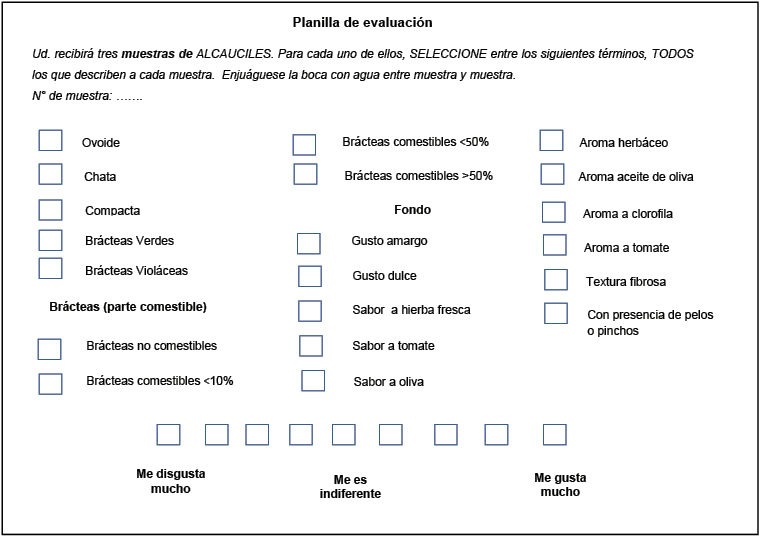 Para la evaluación sensorial se utilizó el método llamado CATA (check all that apply) que consiste en que los participantes seleccionen los términos que consideran apropiados para la descripción de cada producto a partir de un conjunto de términos provistos (Valentin et al., 2012). Para la selección de estos términos se llevaron a cabo sesiones previas con evaluadores entrenados, quienes utilizaron los antecedentes publicados para la descripción de alcauciles.