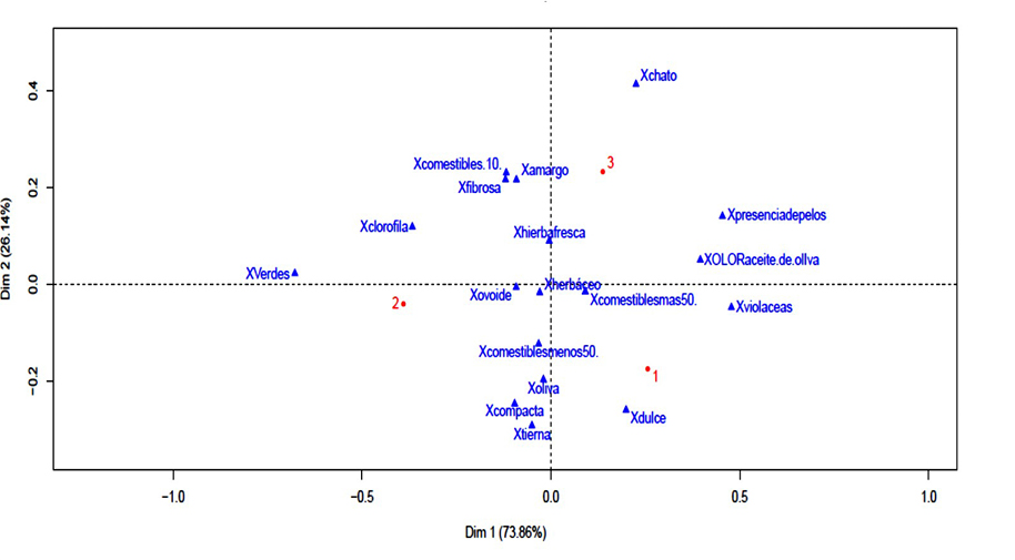 La figura 7 muestra el CA para los resultados obtenidos. Se observa que la primera dimensión (Dim 1) explica el 73,86% de las diferencias encontradas entre los alcauciles. La Dimensión 1 está asociada fundamentalmente al color de las brácteas del alcaucil, ya sea verde o violáceo, a la presencia de pelos y al olor al aceite de oliva. Se destaca como elemento diferenciador el color, verde para Madrigal (2) y violeta para Romanesco (1) y Opal (3). La “presencia de pelos” es un descriptor próximo a los alcauciles Romanesco (1) y Opal (3), lo que indica que el alcaucil Madrigal (2) no posee esta característica. Lo mismo sucede con el descriptor denominado “olor a aceite de oliva”.