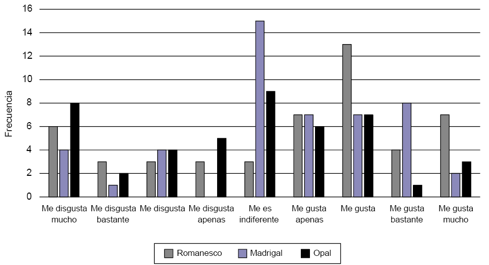 La figura 8 muestra la preferencia de los participantes por cada material. Se observa que el gusto de los participantes por la variedad Romanesco está distribuido según una normal centrada en la frase “Me gusta”, mientras que para los híbridos Madrigal y Opal la moda corresponde a la frase “Me es indiferente”. Sin embargo, mientras que para Madrigal las preferencias se encuentran fundamentalmente entre “Me es indiferente” y “Me gusta bastante”, Opal recibió algunas calificaciones negativas. Romanesco también fue calificado por los participantes en la zona de disgusto.