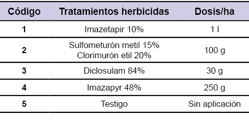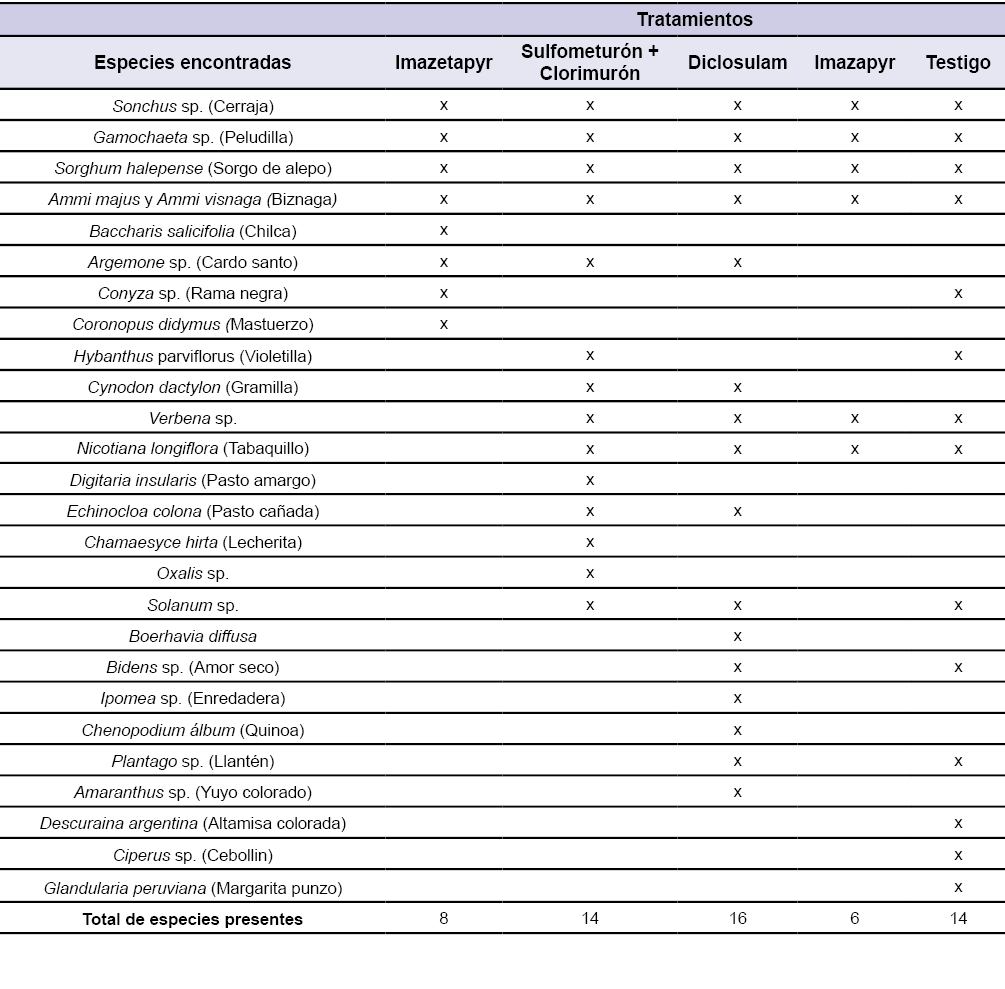Al analizar las especies de malezas presentes en los distintos tratamientos a los 153 días, se observó que los tratamientos con Imazetapyr e Imazapyr fueron los que presentaron menor diversidad de especies. Tal como lo indica la tabla 2.