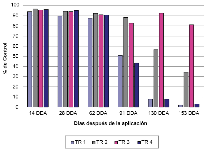 Los resultados obtenidos de las observaciones realizadas muestran que hasta incluso los 62 días posteriores a la aplicación todos los tratamientos superaron el 85% de control.