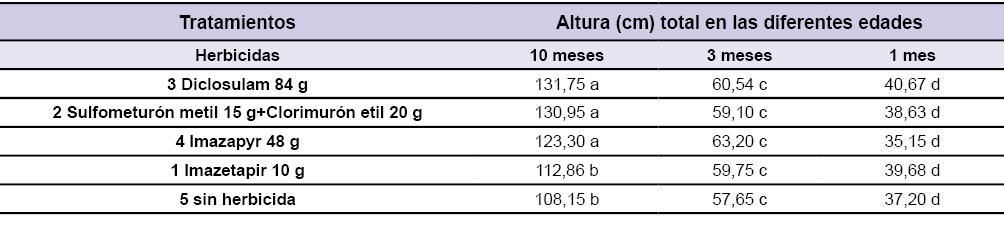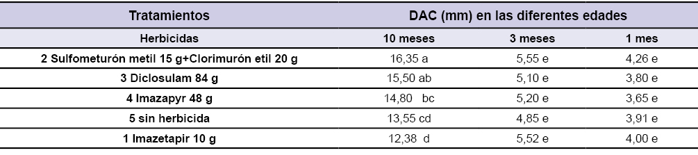 El máximo de cada variable respuesta a los 10 meses se alcanzó con distintos herbicidas. El máximo crecimiento en altura (131,75 cm, 21,9% mayor que el testigo) se logró con la aplicación de Diclosulam con una dosis de 30 g/ha. El máximo de DAC (16,35 cm, 20,7% mayor que el testigo) se alcanzó con la aplicación de Sulfometurón metil + Clorimurón etil, con una dosis de 100 g.ha-1.