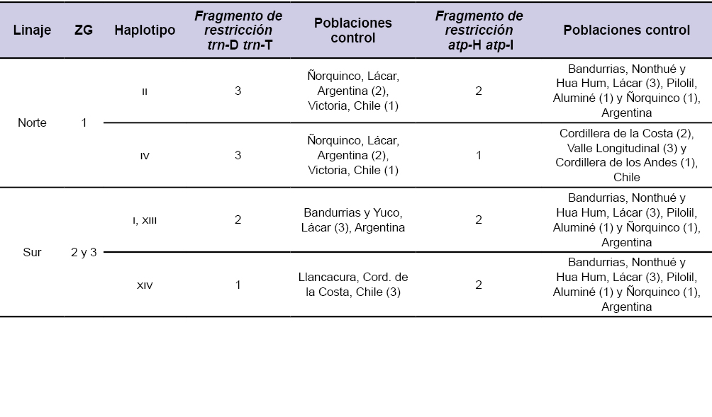 El cpADN de N. obliqua fue secuenciado y descripto por El Mujtar et al. (2014), y además se estudió su variación a nivel poblacional (Azpilicueta et al., 2009). La identificación de dos linajes maternos principales en los bosques argentinos de N. obliqua posibilitó la definición de dos grandes áreas latitudinales con una identidad genética distintiva (Azpilicueta et al., 2009). Mediante el análisis de cpADN los bosques argentinos de N. obliqua fueron ordenados genéticamente según dos grandes linajes maternos, separados latitudinalmente al norte y sur del volcán Lanín (39° 40′ S), conformados respectivamente por dos y tres haplotipos de cpADN en diferentes frecuencias. A su vez, la información generada con marcadores nucleares polimórficos permitió la distinción de tres Zonas Genéticas dentro de estas grandes áreas (tabla 1) (Azpilicueta et al. 2009, Azpilicueta et al., 2013, Azpilicueta et al., 2017).