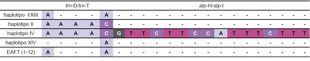 Polimorfismos detectados en cada una de las regiones intergénicas de ADN de cloroplasto analizadas (trn-D/trn-T y atp-H/atp-I). Se muestran los controles (haplotipos i/xiii, ii, iv, xiv) e individuos de la procedencia EAFT (que corresponden a las secuencias de los individuos 1 al 12) analizados. Referencias: A: adenina, T: timina, C: citosina, G: guanina, -: deleción.