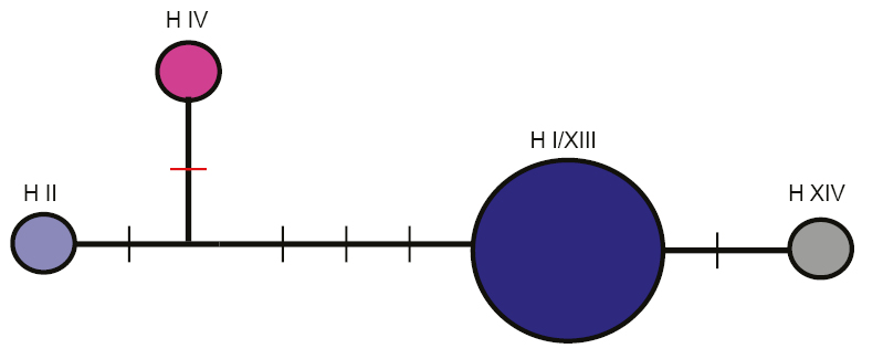 A partir del análisis combinado de las dos regiones intergénicas estudiadas en el presente trabajo, con una longitud de fragmento de 1783 pb, se construyó la red de haplotipos. Las 12 muestras problema (procedencia EAFT) mostraron el haplotipo i/xiii (linaje sur). La relación entre los haplotipos según la cantidad de pasos mutacionales se muestra en la figura 2. Los cuatro haplotipos control se representaron con un solo (1) individuo, respectivamente.