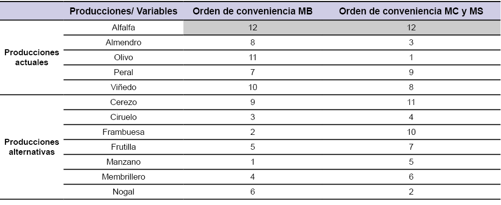 La evaluación ex post de los cultivos plurianuales fue más controvertida, los resultados del MB ponderan con mejor desempeño a tres cultivos alternativos (manzano, frambuesa y ciruelo en orden de relevancia) y el MC y MS a dos cultivos actuales (olivo como primero y almendro como tercero) y uno alternativo (nogal como segundo cultivo con mejor desempeño). En primera instancia, estos resultados son diferentes en su totalidad.