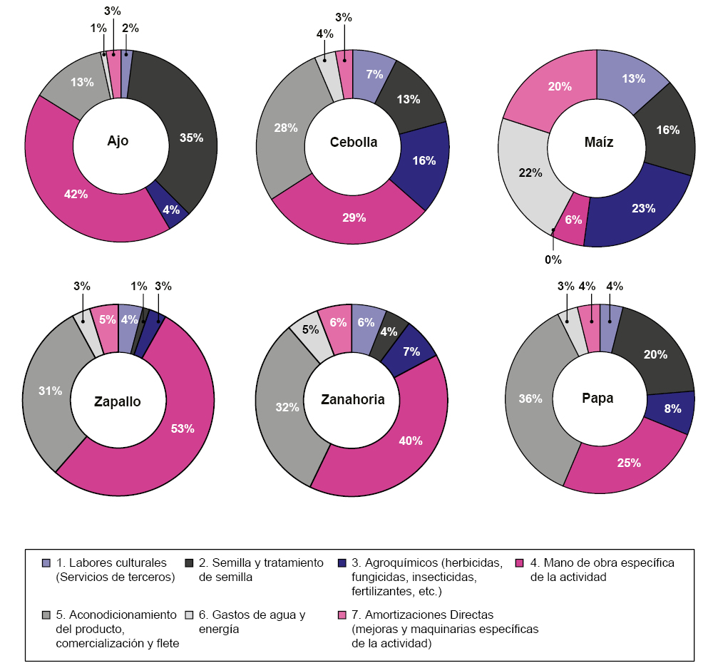 Los cultivos anuales presentan estructuras de costos diversas; según se puede apreciar en la figura 1, los costos que mayor incidencia relativa tienen en 5 de 6 cultivos anuales (ajo, cebolla, zapallo, zanahoria, papa) son la mano de obra y el acondicionamiento y comercialización de los productos (entre 12,7% y 52,2%). Para el cultivo de maíz, con un comportamiento diferente de incidencia relativa de costos, los rubros más importantes son agroquímicos, gastos de agua y energía y amortizaciones; entre los tres rubros suman 64,9% de los costos asociados. En el cultivo de ajo (alternativo) toma relevancia el costo vinculado a las semillas y su tratamiento (35,5%).