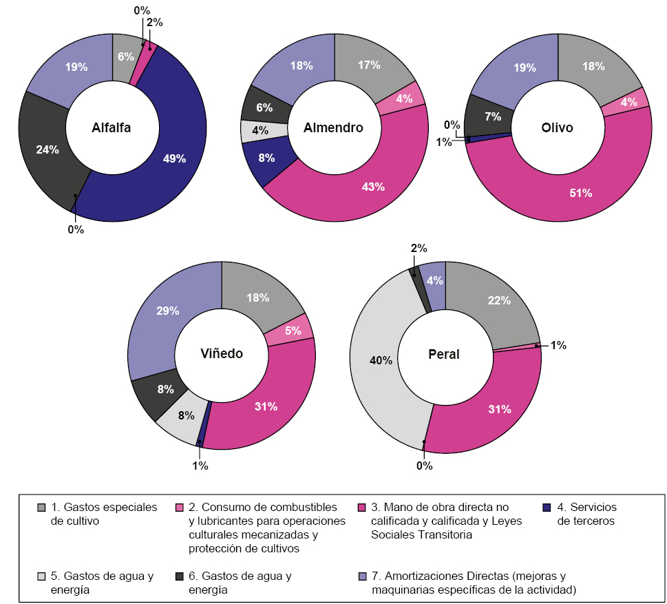 Elaboración propia.El costo más relevante de los cultivos plurianuales actuales (figura 2) es, para 4 de 5 (almendro, olivo, viñedo y peral), la mano de obra (de 30,7% a un 51,1%). Los gastos especiales de cultivo son también relevantes en todos los casos menos en la alfalfa (de 16,6% a 22,5%). Otro rubro importante son las amortizaciones, con peso en los cultivos de alfalfa, almendro, olivo y viñedo. En el peral tienen una incidencia notable los costos de acondicionamiento y comercialización (el costo más importante para ese cultivo, con un 39,8%).