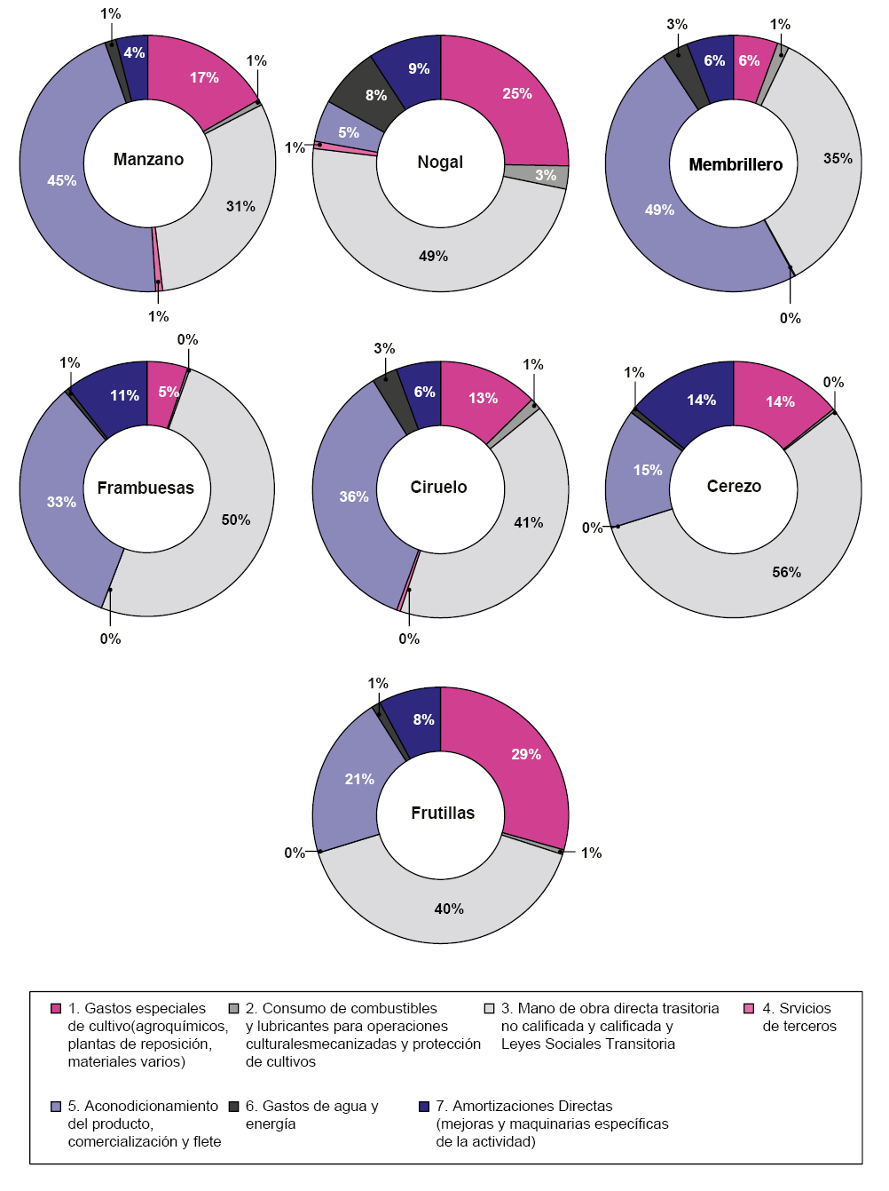 Elaboración propia.En todos los cultivos plurianuales alternativos, la mano de obra es un costo preponderante (figura 3), significando proporcionalmente desde un 30,7% a un 55,6%. Los costos de acondicionamiento y comercialización son relevantes en 6 de los 7 cultivos (manzano, membrillo, frambuesa, ciruelo, cerezo y frutilla). Los gastos de agua y energía, con especial impacto en los cultivos de nogal y frutilla, es también otro rubro que pesa en gran parte de los cultivos (5 de 7).