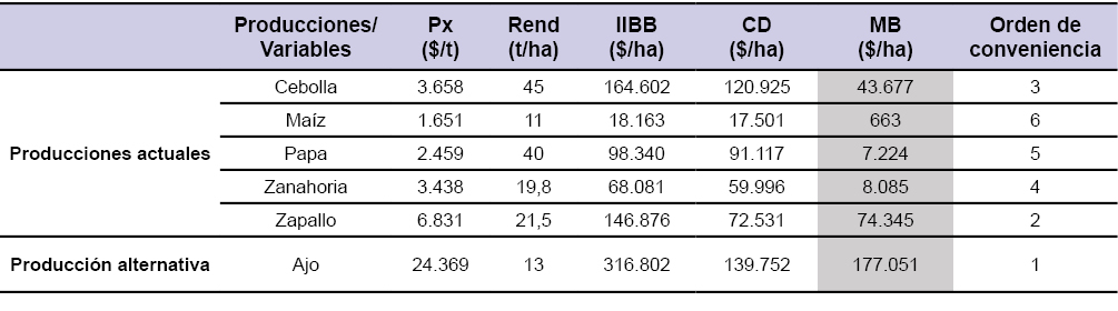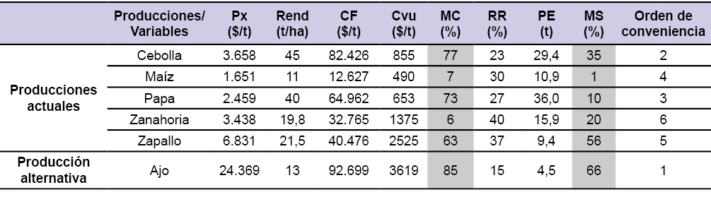 Si analizamos los resultados de los márgenes brutos de las actividades anuales, actuales y alternativas (tabla 1), el ajo es el cultivo que mejor resultado arrojó, con un MB de 177.051 $/ha, seguido del zapallo (74.345 $/ha) y la cebolla (43.677 $/ha). El cultivo con el peor MB fue el maíz (663 $/ha), seguido por la papa (7.224 $/ha) y la zanahoria (8.085 $/ha).