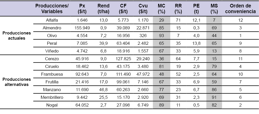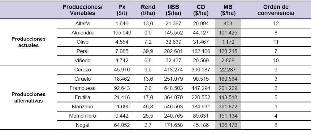 Elaboración propia.En las producciones plurianuales, los seis primeros cultivos más convenientes desde la perspectiva del MB son alternativos (tabla 2); el mejor posicionado fue el manzano, con un MB de 361.872 $/ha, seguido por la frambuesa (201.209 $/ha) y el ciruelo (160.564 $/ha). Los tres cultivos con desempeño más desfavorable son producciones actuales; el peor MB lo obtuvo la alfalfa (403 $/ha), seguido por el olivo (1.172 $/ha) y el viñedo (2.868 $/ha).