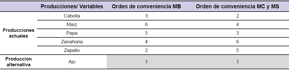 Como se puede apreciar en la tabla 5, el ajo ha sido el cultivo anual (alternativo) con mejores resultados en ambas metodologías. La cebolla (cultivo actual) fue jerarquizada como la tercera mejor opción en el MB y como la segunda en el costeo variable. Las diferencias llamativas se encuentran en el zapallo, donde, según los resultados del MB es el segundo cultivo más conveniente, y para el costeo variable es el quinto. También es notable el caso de la papa, recomendada por el costeo variable (tercera en orden jerárquico de resultados) y quinta en MB.
