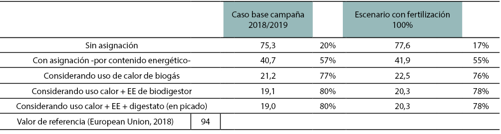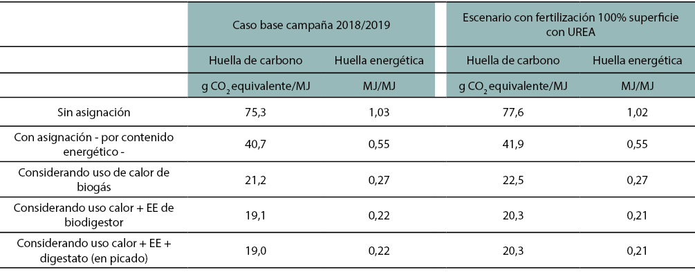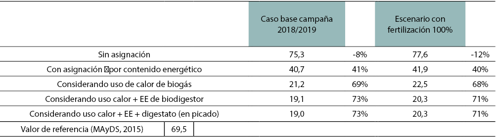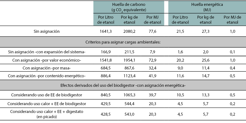 La asignación de cargas ambientales se hizo por contenido energético, lo que otorga al etanol el 54% del impacto de la cadena productiva; el restante porcentaje se asigna a los subproductos. El biodigestor evita el uso de GLP para la generación de calor, lo que supone un ahorro en la Huella de Carbono, ya que estas representan el 49% del total. El uso de energía eléctrica generada en los motores del biodigestor también implica una disminución del impacto, pero no tan notorio como en el caso del calor; las emisiones bajan del 6,55% al 1,37% del total (-5,18%). El reemplazo de la urea por digestato en el maíz destinado a silaje, reduce el impacto en un porcentaje menor, esto se debe a que las emisiones de la urea no son relevantes en la cadena del maíz para silo, y una porción de ellas se compensan en la aplicación del digestato.