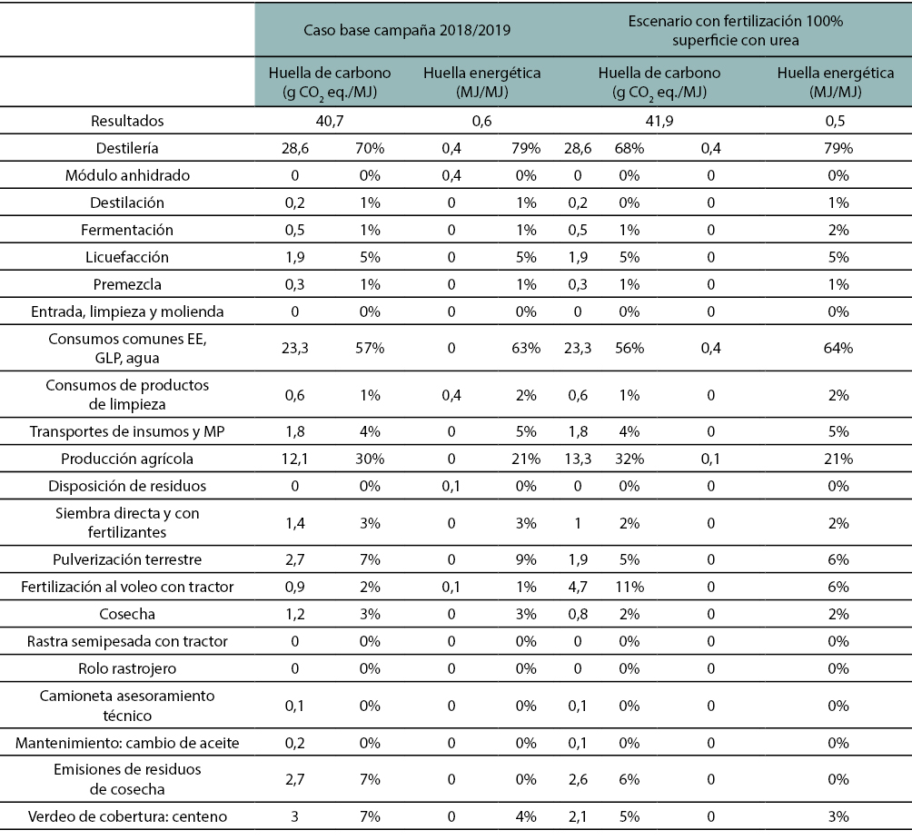 Dentro de la etapa agrícola, se destacan las emisiones del verdeo de cobertura, que se contabiliza como un todo, también de la operación de pulverización y en menor medida las operaciones de siembra, fertilización y cosecha. También tienen un alto valor las emisiones de los residuos de cosecha, principalmente se trata de emisiones de óxido nitroso (N2O) que tiene un alto factor de calentamiento, que equivale a 265 veces el dióxido de carbono (CO2). Por el lado de la destilería, se destacan las emisiones derivadas del uso del GLP, tanto por su producción como por su quema. También las emisiones por la generación de energía eléctrica y en menor medida el uso de otros insumos utilizados en el proceso y sus transportes.