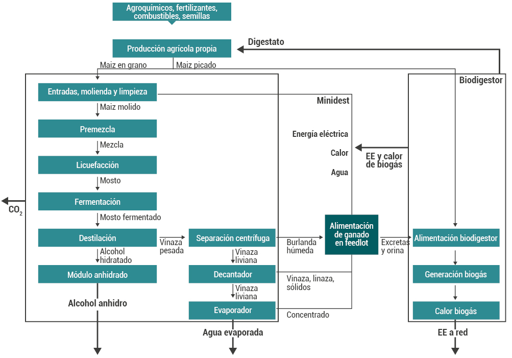 Minidestilería: abarca la recepción y limpieza del grano de maíz, el traslado y uso de insumos como aditivos, enzimas, productos de limpieza, agua, entre otros y los consumos energéticos durante todo el proceso, hasta la obtención del etanol anhidro y los subproductos asociados. También se incluyen las operaciones de acondicionamiento de dichos subproductos previo ingreso al feedlot.
