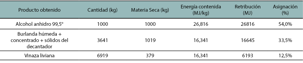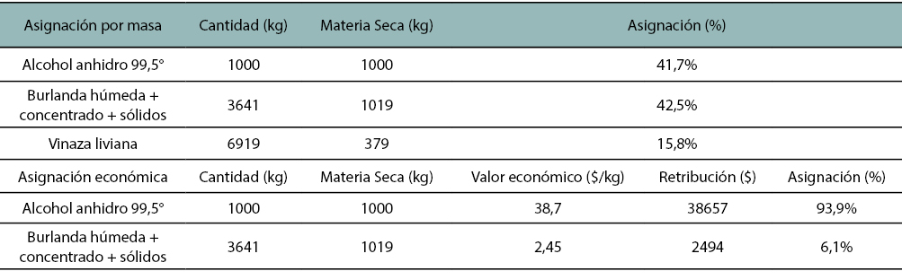 Además del criterio de asignación por contenido energético, se calcularon los impactos obtenidos con el criterio de asignación de masa y el criterio de asignación económico para el etanol y los subproductos. En el caso de la asignación por criterio económico no se cuenta a la vinaza por no tener valor de mercado.