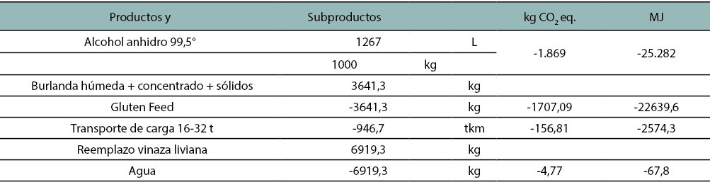 Otra técnica usada dentro de la metodología de Análisis de Ciclo de Vida para “restar” parte de la carga ambiental del proceso al producto principal y derivarla a los subproductos es la denominada expansión del sistema. Esta técnica define qué productos del mercado son reemplazados con los subproductos y calcula su carga ambiental para luego restarla al impacto total del producto principal en estudio. De este modo se asume que el producto reemplazado no llegará a ser fabricado, evitando su impacto y cargando ese beneficio al producto objeto de estudio. En el caso de los subproductos de la destilería, todos son usados para alimentación de animales, reemplazando el uso del alimento alternativo Gluten Feed y agua. Se cuenta también el impacto evitado por el transporte de Gluten Feed hasta el lugar donde sería consumido. Se tomaron perfiles de la base de datos EcoInvent con el impacto ambiental unitario de la producción/generación de estos productos y se multiplicaron por las cantidades que serían reemplazadas con los subproductos de la destilería. Finalmente, los valores de impacto evitado se restan al impacto total del proceso de producción del etanol (tabla 4).
