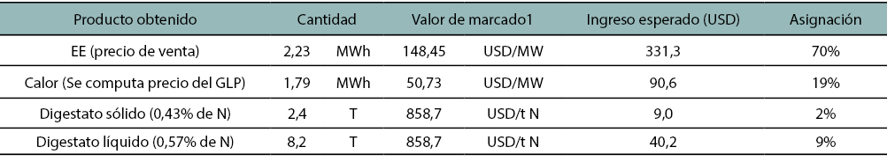 Los productos obtenidos del biodigestor también deben distribuir la carga ambiental que arrastran “aguas arriba”. En este caso se obtienen cuatro productos principales con valor, que son energía eléctrica, calor, digestato sólido y digestato líquido. Para representar el impacto ambiental de esta etapa, focalizada en la producción de energía eléctrica, los autores decidieron hacer una asignación por valor económico, tomando el precio de venta de la energía eléctrica a la red de: 148,45 USD/MW. El cambio del criterio de asignación se debe a que se tuvieron en cuenta los usos y costumbres empleados en otras industrias del sector, como así también para poder asignarle un impacto ambiental al digestato basado en su valor. El valor económico del calor del biodigestor se asumió igual al precio del calor generado actualmente: 39,3 ARS/kg de GLP, considerando un poder calorífico de 12,91 kWh/kg de GLP y un tipo de cambio de 60 ARS/USD.