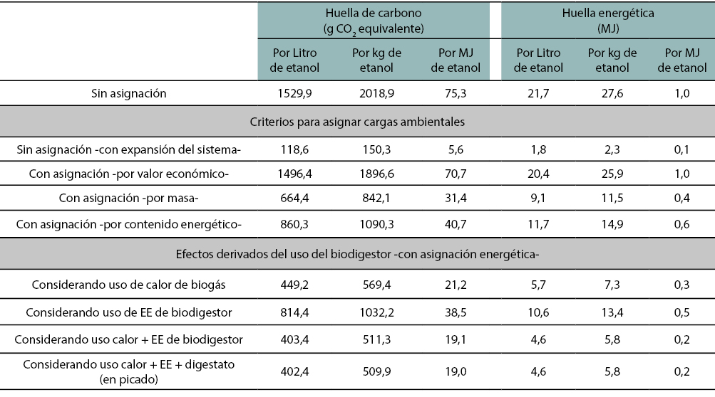 Los resultados muestran que la asignación por contenido energético otorga al etanol el 54% del impacto de la cadena productiva; el restante porcentaje se asigna a los subproductos. Evitar el uso de GLP en la destilería supone un significativo ahorro en la huella de carbono del etanol, ya que estas representan el 51,5% del total (producción, transporte y quema del GLP); su reemplazo con calor de biodigestor genera impacto, pero este representa solo el 5% de las emisiones totales, por lo que la reducción de la huella llega al -46,5%.