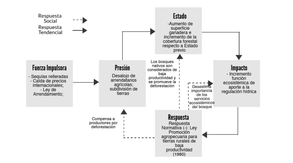 Esta respuesta social (ver figura 3) estableció como bosques protectores y permanentes a aquellos de propiedad privada que cumplieran una determinada utilidad pública a los fines de un mejor aprovechamiento de las tierras, reduciendo la presión (deforestación) mediante una restricción al dominio del titular de la tierra. Asimismo, la ley promovió la mitigación del impacto mediante la forestación y reforestación de aquellas zonas en donde los bosques fijen médanos con el fomento de créditos especiales de los bancos públicos.