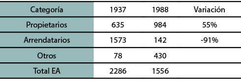 Estas tres fuerzas impulsoras generaron el desplazamiento de la actividad agrícola (llevada a cabo principalmente por arrendatarios) por la ganadería (Barsky y Gelman, 2001) y consecuentemente disminuyeron la presión sobre el bosque nativo. Las leyes sancionadas en este período promovieron a los propietarios de la tierra (latifundistas) a desalojar a gran parte de los productores agrícolas arrendatarios que migraron hacia centros urbanos (Barsky y Pucciarelli, 1991). En paralelo, se fomentó la división de la tierra de los latifundistas y se facilitaron créditos a los arrendatarios para adquirir tierras que trabajaran en arrendamiento (Barsky y Pucciarelli, 1991). Consecuentemente, entre 1937 y 1988, aunque se redujo el número de explotaciones agropecuarias se observa un crecimiento de explotaciones con productores propietarios de la tierra que pasan 635 a 984, esto es un incremento de más del 50%, y una reducción de más de 90% de las explotaciones con productores-arrendatarios (pasa de 1573 a 142) (ver más detalles en la tabla 6).