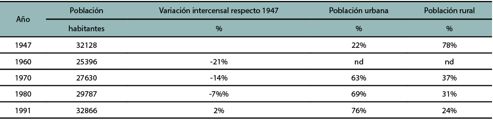 Elaboración propia a partir de CNA 1937 (DEIE, 2018) y 1988 (INDEC, 2018).En términos de población absoluta se observa un decrecimiento de un 21% de la población en 1960 respecto de 1947, recuperando esta cantidad de habitantes 44 años después (tabla 7). En el caso de población rural, se observa una disminución relativa de 41% entre 1947 y 1970, siendo absorbida por las localidades del mismo departamento, pero principalmente migran hacia otros centros urbanos de otros departamentos (Busso, 1996).