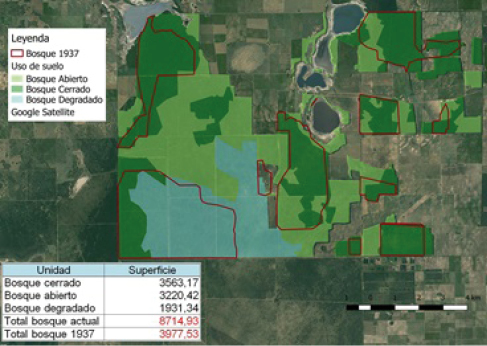 Elaboración propia a partir de Censos Nacionales 1947, 1960, 1970, 1980, y 1991. nd: dato no disponible.Esta combinación de factores produjo un cambio en las variables del estado del ambiente: un crecimiento significativo de la superficie asignada a ganadería y una regeneración del bosque perdido en el período precedente. La superficie pastoreada aumenta de 683.165 a 874.891 hectáreas, la superficie cultivada agrícola se redujo de 356.827 a 173.188 hectáreas y la superficie de bosque se incrementó de 54.172 a 82.357 hectáreas. Por ejemplo, dentro del área de estudio, en la Estancia Ralicó, en el primer período funcionó un sistema de arrendamiento con colonos que deforestaban para incrementar las hectáreas agrícolas. Sin embargo, en el segundo período se desalojaron los colonos y debido a la menor fuerza de trabajo, como no podían mantener el área cultivada con pasturas o agrícola, el área con bosque en dicha estancia se incrementó entre 1937 (3.977 hectáreas) y 2002 (8735 hectáreas) en un 120% (figura 5).