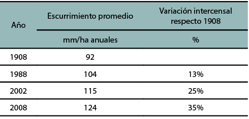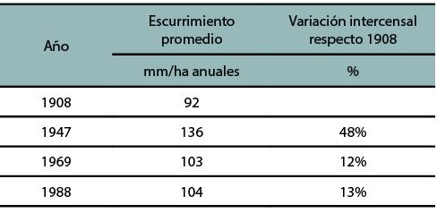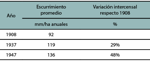 CNA, (2002) y Plevich (2017).Este nuevo estado del ecosistema redujo en términos de impacto ambiental la vulnerabilidad del ecosistema y permitió mejorar el servicio ecosistémico de regulación hídrica. A partir de la reducción de cultivos anuales, el incremento de la superficie con pasturas de este período y el proceso de regeneración del bosque se redujeron los niveles medios de escurrimiento del suelo, pasando de 138 a 103 mm/ha en promedio entre los años 1947 y 1969 (tabla 8).