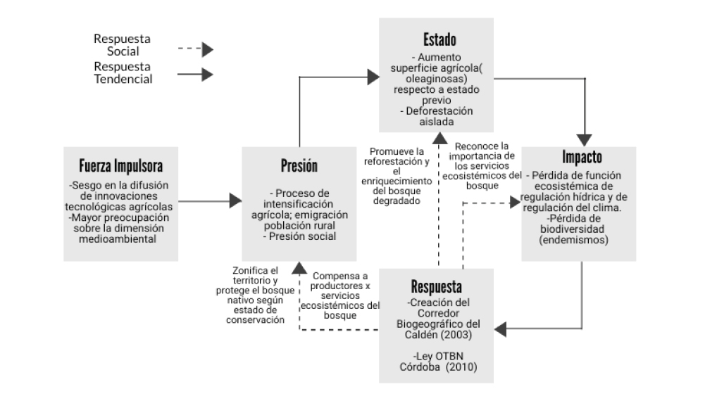 Abstract: In this work, the causes and responses that account for the area of the caldén forest in Córdoba of the last century are systematized. From the conceptual framework Driver Pressure State Impact Response, and using data from national agricultural censuses it was possible to establish the causal relationships that explain this phenomenon. The drivers that exerted pressure on the caldén forest have been different, as well as their impacts associated with the ecosystem catastrophes that have occurred. Consequently, the responses induced by these catastrophes have been included in the collective agenda, although partially, since the forest producers had a disintegrated vision with the rest of the land uses and have not considered the use of the forest in perpetuity. Understanding the causes and social responses of the processes that occur in the forest area is a useful tool for the design of renewed conservation policies for the native forest.