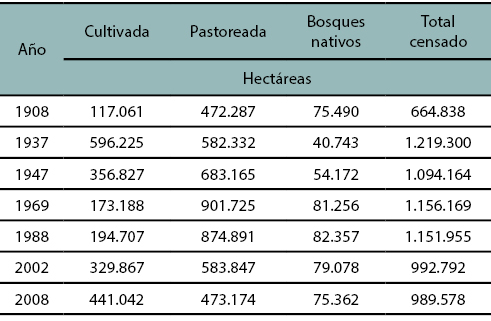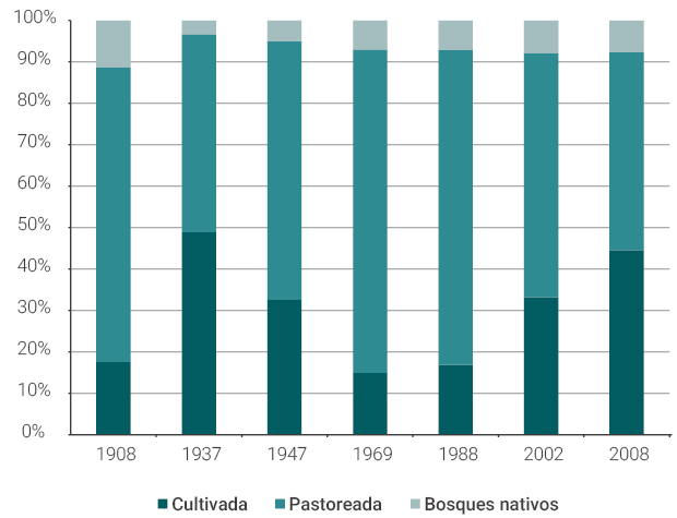 Elaboración propia con base en CNA 1914 (DEIE, 2018).El resultado de esta presión fue el reemplazo del ecosistema natural de bosque y de pastizal natural por pasturas implantadas y cultivos. Los propietarios ganaderos iniciaron un proceso de rotación trienal de arrendatarios a los que se les asignaba lotes de pequeñas superficies en zonas ocupadas en su totalidad o parcialmente de bosque o pastizal natural, los cuales debían ser cultivados (trigo y lino) y posteriormente se debían devolver alfalfados (Alonso, 2009). Como puede observarse en la tabla 1, la expansión de los cultivos agrícolas se produjo hasta 1937, pasando de 3.100 hectáreas de trigo en el año 1890 a 117.000 hectáreas en el año 1914, y alcanzó el máximo de casi 600.000 hectáreas cultivadas hacia 1937; consecuentemente se produjo la expansión de los cultivos, principalmente sobre pastizales naturales y, en menor medida, debido a la deforestación (de 75.490 a 40.743 hectáreas de bosque).