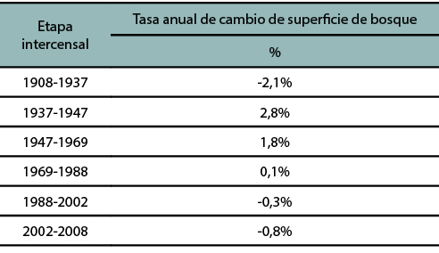 Tasa anual de cambio de superficie de bosque 1908-2008.