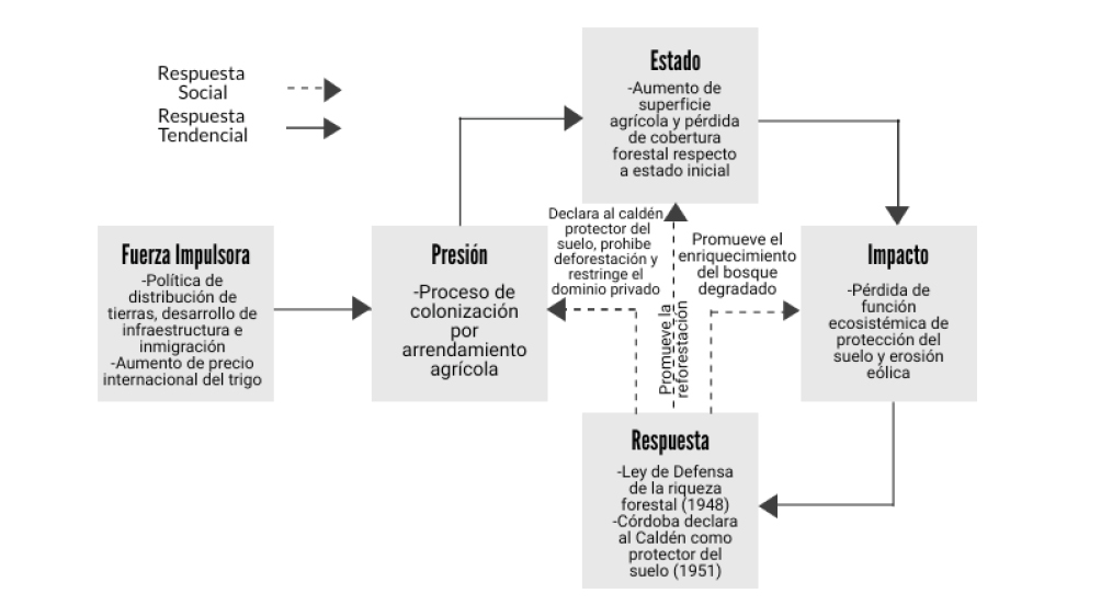 Elaboración propia.Tres fuerzas impulsoras se consideraron relevantes en el período de regeneración. La primera fuerza impulsora fueron los eventos naturales extremos (sequías reiteradas) que afectaron a toda la región. La expansión agrícola con un modelo tecnológico que no consideró la fragilidad de los ecosistemas provocó un fuerte y reiterado proceso de erosión eólica del suelo (Instituto de Suelos y Agrotecnia, 1948; Viglizzo y Frank 2006). La segunda fuerza impulsora estuvo asociada a la fuerte caída de los precios internacionales de los cereales en la década de 1940, en particular, el trigo (Fúster, 1954). La tercera fuerza impulsora en este período fue el efecto de la Ley de Arrendamiento y las políticas crediticias de acceso a la tierra. En la región en estudio, dicha ley tuvo un efecto contrario ya que redujo la cantidad de arrendatarios.