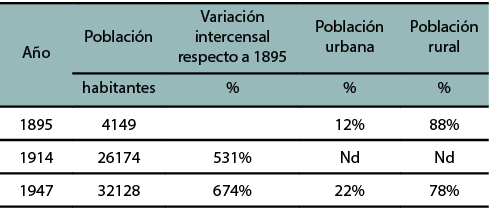 Distribuidas las tierras y desarrollada la infraestructura, se inicia el proceso de presión a partir de la colonización y puesta en producción por arrendamiento agrícola. Como puede observarse en tabla 3, la población se incrementa en un 674% en 1947 respecto de 1895 (4194 habitantes); la mayoría es población rural.