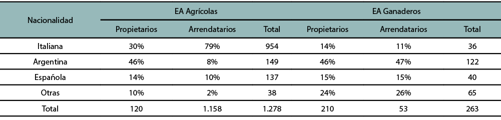 Elaboración propia a partir de datos Censos Nacionales 1895, 1914 y 1947. Nd: dato no disponible.En este sentido, los propietarios de las estancias dividen la tierra en unidades menores, arrendando a colonos y, en menor medida, vendiendo (cesión de la propiedad) a inmigrantes, predominantemente de nacionalidad italiana. En la tabla 4 se puede apreciar una gran presencia de arrendatarios en los establecimientos agrícolas (90% del total) en contraste con los establecimientos ganaderos (solo un 20% de arrendatarios del total).
