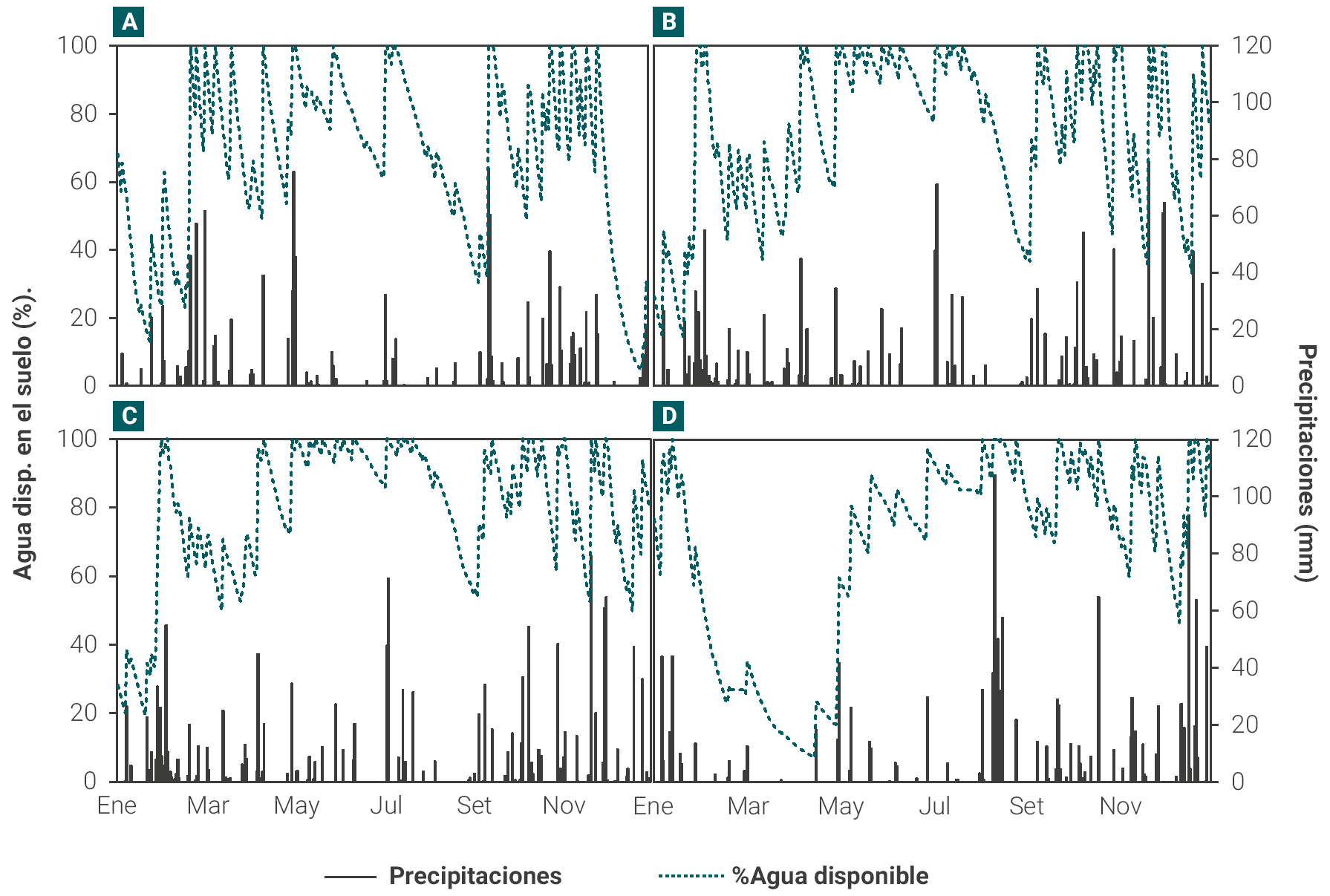 En la figura 1 se puede observar la evolución del porcentaje de agua disponible en el suelo (PAD) y las precipitaciones ocurridas diarias para los dos experimentos particionado por años.