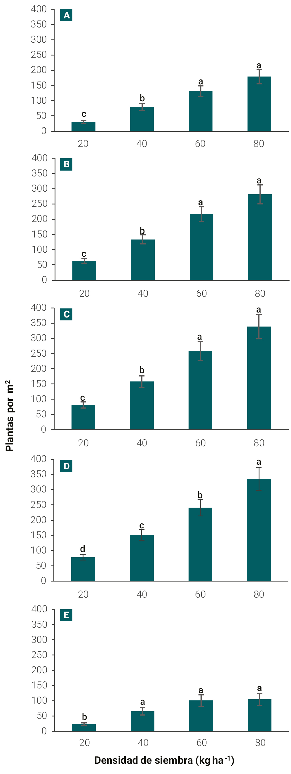 Número de plantas por m2 de Bromus auleticus según densidad de siembra para 30, 60, 90, 120 Y 365 días desde siembra (A, B, C, D y E, respectivamente) correspondiente a las siembras 2013 y 2014 en forma conjunta. Letras minúsculas diferentes entre medias indican diferencias estadísticas (p<0,05). Elaborada para la presente edición.