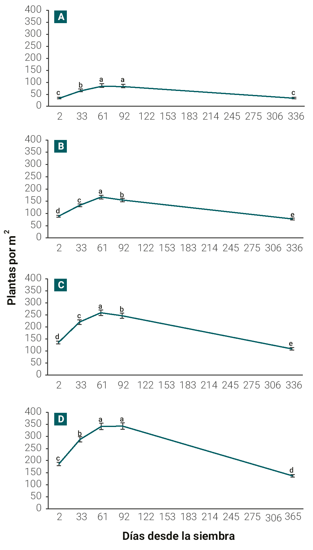 A partir de los resultados de los experimentos 2013 y 2014 es posible la identificación de un patrón de evolución temporal de la densidad de plantas. Una primera fase en la que aumenta hasta los 90 días, una segunda fase entre los 90 y 120 días en la que permanece constante (20 y 80 kg ha-1) o se mantiene con un número de plantas por m2 mayor respecto a la primera fase (40 y 60 kg ha-1) y luego una tercera fase en la que disminuye hasta el año postsiembra (figura 3). El mismo patrón temporal fue observado por Finozzi y Quintana (2000) en suelos de Basalto donde, tanto en suelos superficiales como medios y profundos, registraron una fase de ascenso, otra de estabilización y sobre el verano una de descenso la que coincide con el incremento de temperaturas.