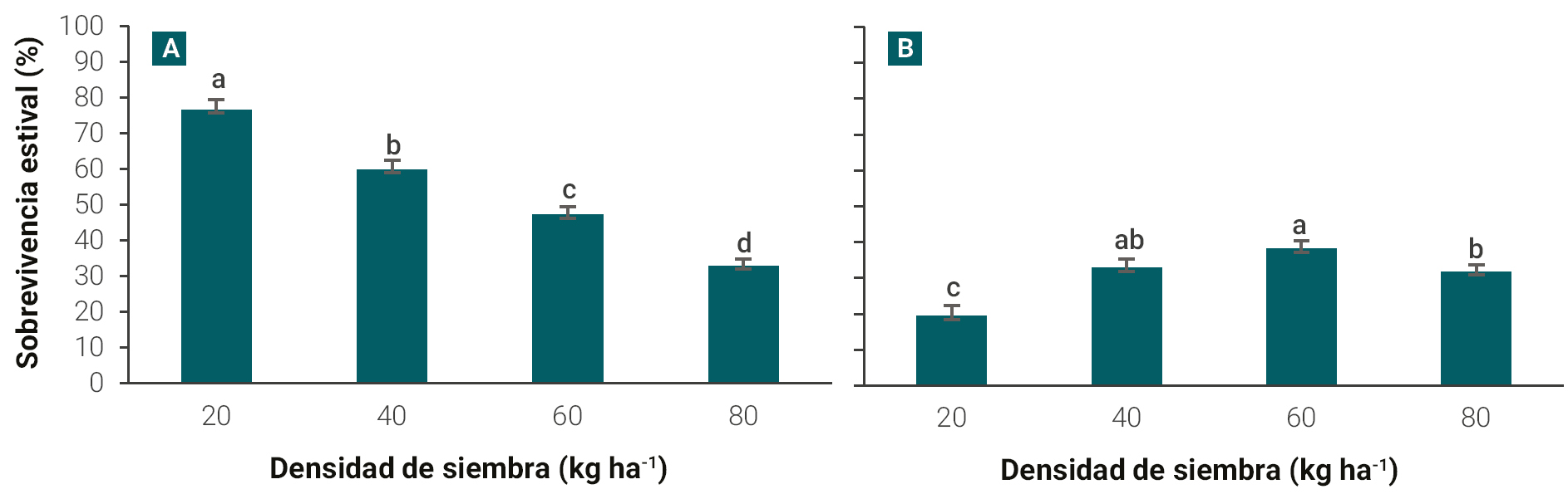 Sobrevivencia estival según densidad de siembra para los experimentos 2013 y 2014 (gráficos A y B, respectivamente). Letras minúsculas diferentes significan diferencias significativas para una misma variable (p<0,05). Elaborada para la presente edición.