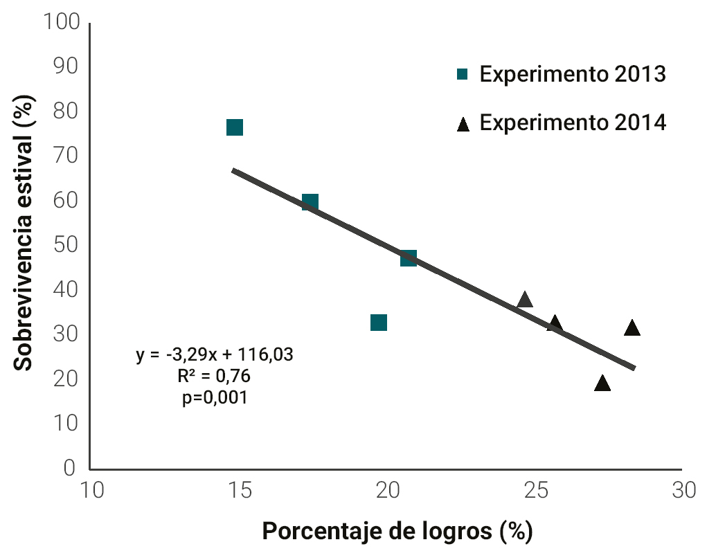 A diferencia de lo ocurrido para el porcentaje de logros, en el caso de la sobrevivencia estival se observaron menores porcentajes (p<0,0001) en el experimento 2014 respecto al experimento 2013. Los porcentajes de sobrevivencia estival para este último fueron de 52% mientras que en el experimento.